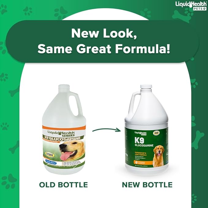 LIQUIDHEALTH 128 Oz K9 Liquid Glucosamine for Dogs, Puppies and Seniors - Chondroitin, MSM, Hyaluronic Acid – Dog Hip and Joint Health, Dog Vitamins for Dog Joint Pain, Dog Joint Oil - 1 Gallon