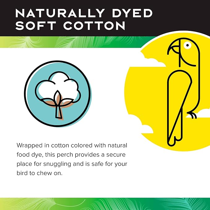 • NATURALLY DYED, SOFT COTTON: Wrapped in cotton and colored with natural food dye, these act as perches, rings, and small bird toys; Our soft cotton ring provides a secure place for snuggling and is safe for your bird to chew on