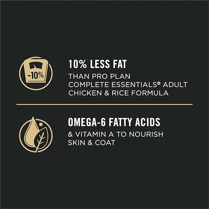 • 10 percent less fat than Pro Plan COMPLETE ESSENTIALS Adult Chicken and Rice Formula
