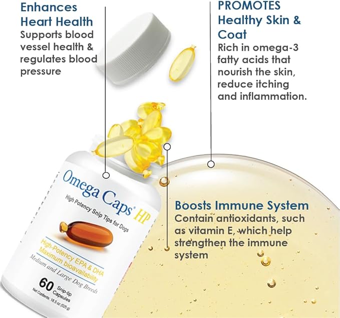Omega Caps HP Snip Tips for Medium and Large Dogs High Potency EPA and DHA Maximum Bioavailability Fish Oil Supplement Vet Formulated Made in USA Skin Coat Joint and Heart Health 60 Capsules