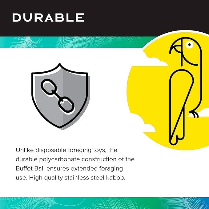 - DURABLE: Unlike disposable foraging bird toys, the durable polycarbonate construction of the Buffet Ball ensures extended foraging use; High quality stainless steel attachment is easy to install