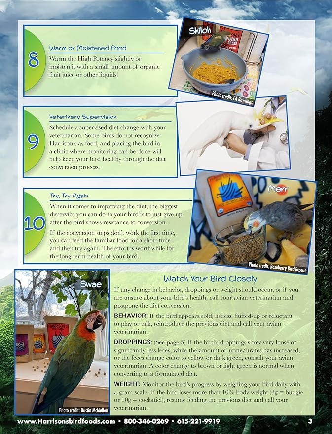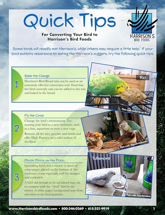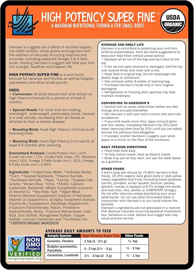 • FOR SMALL BIRDS: Harrison's Bird Foods HIGH POTENCY SUPER FINE, a certified organic, non-GMO formula crafted by avian veterinarians and avian nutritionists for canaries, finches, budgies, parrotlets, cockatiels, lovebirds, and other small birds. It ensures essential nutrition in a nutrient-dense formula for converting to our formula, under 1 year of age, breeding, weaning chicks, recovering from an illness, or molting.