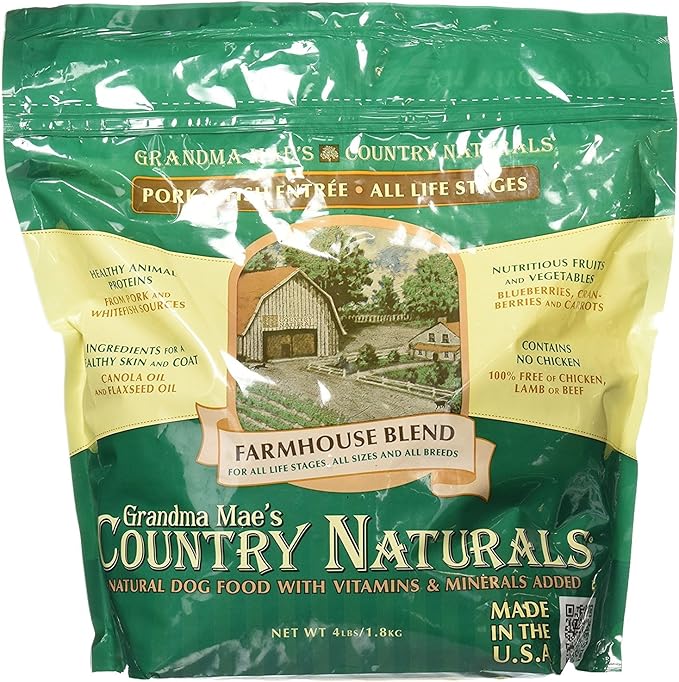 • Contains one (1) 4 lb Bag of Grandma Mae's Farmhouse Blend Adult Dry Dog Food Pork and Whitefish