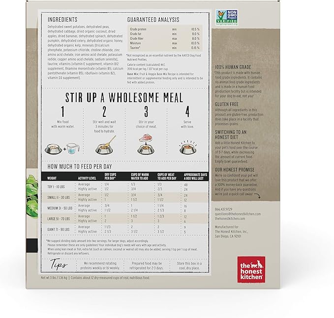 The Honest Kitchen Dehydrated Grain Free Fruit & Veggie Base Mix Dog Food (Just Add Protein), 3 lb Box