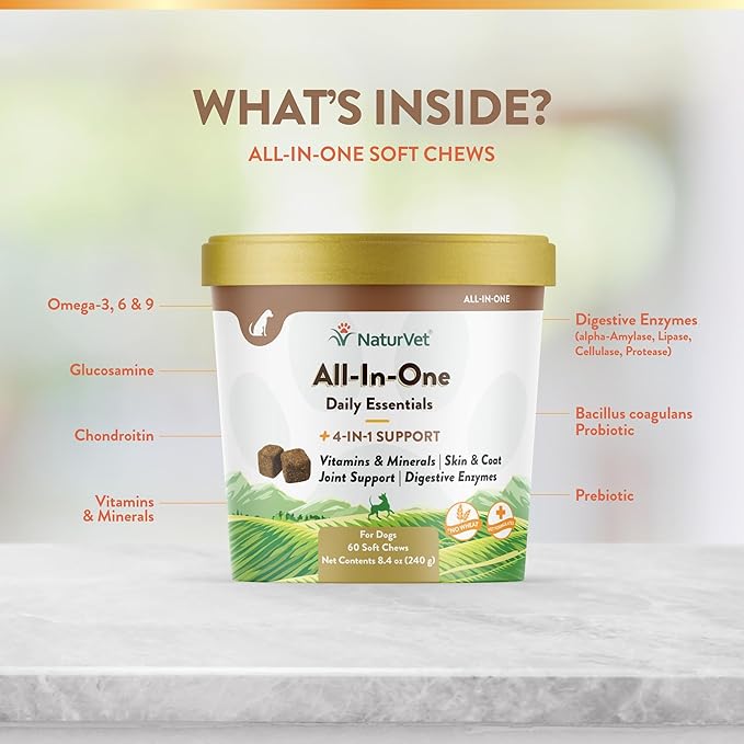 - WHOLESOME DOG SUPPLEMENTS: NaturVet All-in-One Dog Supplement features glucosamine and chondroitin for pet joint support, Omegas 3, 6 and 9 for skin & coat, enzymes & probiotics to ensure proper absorption of nutrients and essential vitamins and minerals for the overall health for dogs of all ages.