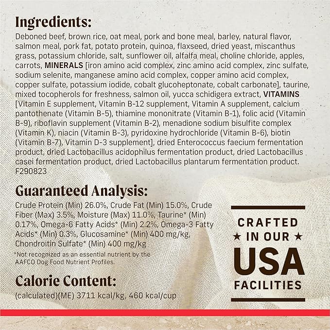 - Premium beef kibble with ancient grains features leading levels of glucosamine and chondroitin for dogs, to provide hip and joint support in adult dogs