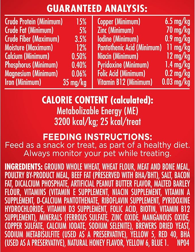 • Contains one (1) seven (7) pound box of naturally and artificially flavored dog biscuits in three (3) flavors: Peanut Butter, Peanut Butter & Bacon, and Peanut Butter & Honey (packaging may vary)
