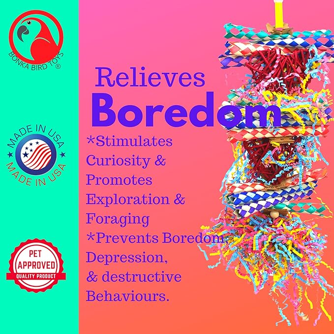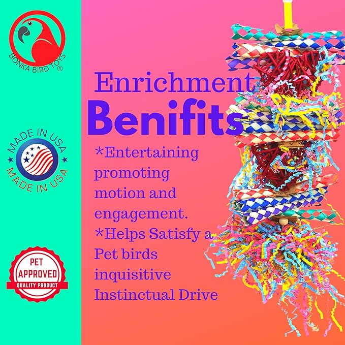 • Ideal for medium-sized birds, encouraging interactive play. Features bamboo finger traps and colorful shreddy paper for shredding fun. Two natural vine hearts filled with shreddy paper for foraging. Measures 12.5"H x 5.5"W x 1.5"D, weighing under 2 ounces. 100% bird-safe materials, in bright assorted colors.