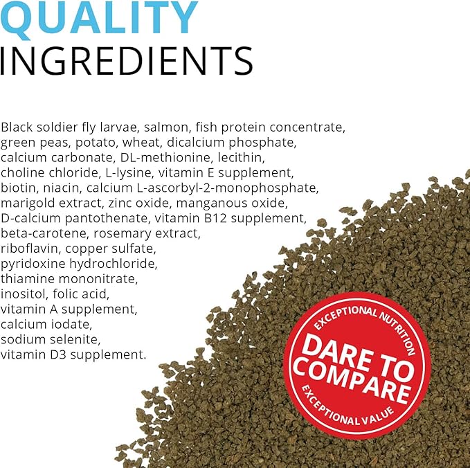 • Tropical fish food that contains up to 40%, nutrient-rich Black Soldier Fly Larvae, the first ingredient