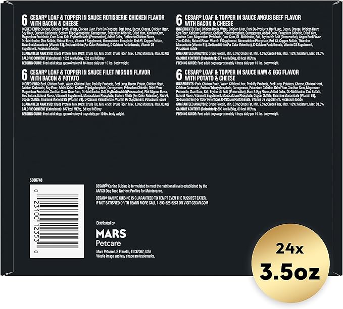 Cesar Wet Dog Food Loaf in Sauce Rotisserie Chicken, Filet Mignon, Angus Beef, and Ham & Egg Flavors Variety Pack, 3.5 oz. Easy Peel Trays (24 Count, Pack of 1)
