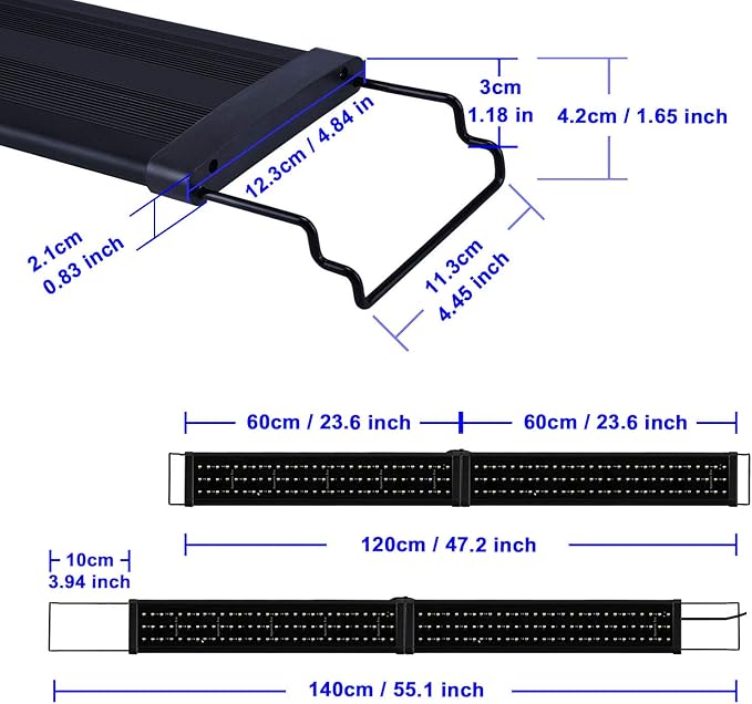 - 2 22.5 inch lights that needs to be merged together using retractable brackets to form 1 set which is suitable for Tank Length: 120cm/ 48inch- 150cm/ 60inch. With extendable bracket to fits your tank. Lumen :5355. Power: 33.5-34W.