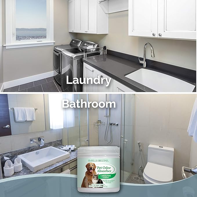 SMELLS BEGONE Air Freshener Odor Absorber Gel - 15 oz, Pack of 2 - Absorbs and Eliminates Odor in Pet Areas, Bathrooms, Cars, & Boats - Made with Essential Oils - Calming Rain Scent