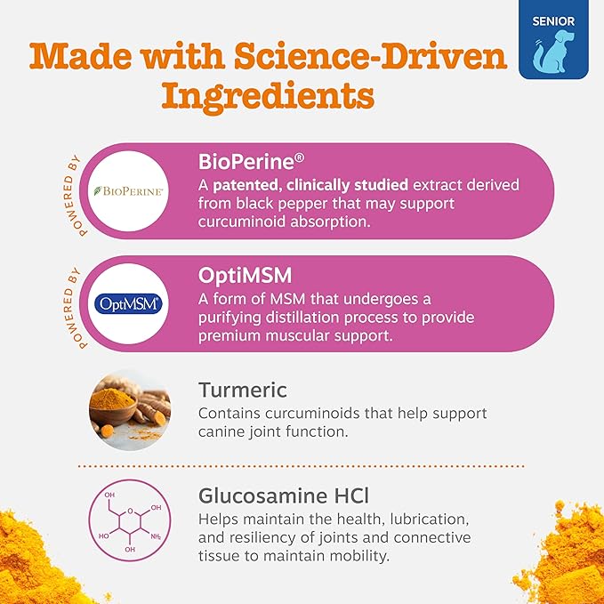 - Turmeric Extract & BioPerine - These senior dog joint supplement contain curcuminoids from Turmeric Extract and BioPerine to better absorb the curcuminoids.