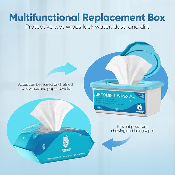 - CONVENIENT STORAGE AND DISTINCTIVE BOX DESIGN: The PUPMATE experience is about convenience, and our pet wipes exemplify this principle. Encased in a moisture-sealed box that shields them from dust and light, they're primed for use at a moment's notice. Be it your adventures outdoors or cozy moments at home, our dog wet wipes take on the role of unwavering protectors, an indispensable resource for your pet's joy