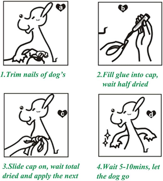 - 【Applying Tips】The dog nail covers home kit are designed for dogs. It’s 2 person’s job. TIPS: 1. Correct size is important. Try one on without glue. If not fit, trim the open of the cap until fit your dog's caps snugly. OR, return for replacement 2. Trim and smooth dog’s nails 3. Make sure that fur are separated with the paw, to avoid sticking together 4. Use a little glue into the cap, not too much, ONLY cover your dog’s nail. More tips, please refer to the Description.