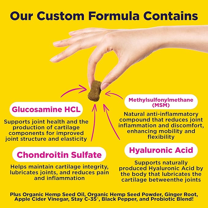 - Joint Pet Supplement with Hemp: Each healthy dog bite is enriched with Glucosamine and Hyaluronic Acid, which helps maintain cartilage and joint mobility