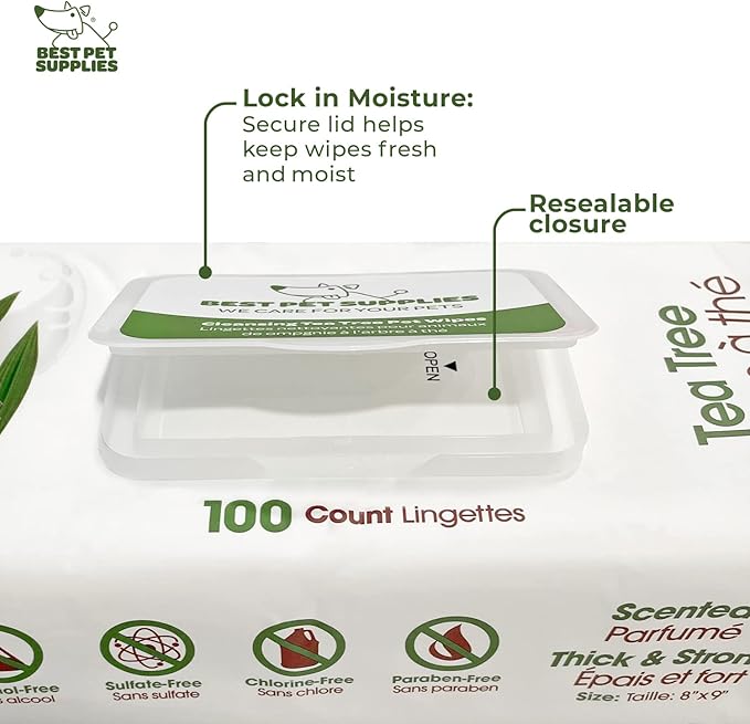 Best Pet Supplies Pet Grooming Wipes for Dogs, 100 Pack, Plant-Based Deodorizer for Coats & Dry, Itchy, or Sensitive Skin, Clean Ears, Paws, Body, & Butt - Cleansing Tea Tree