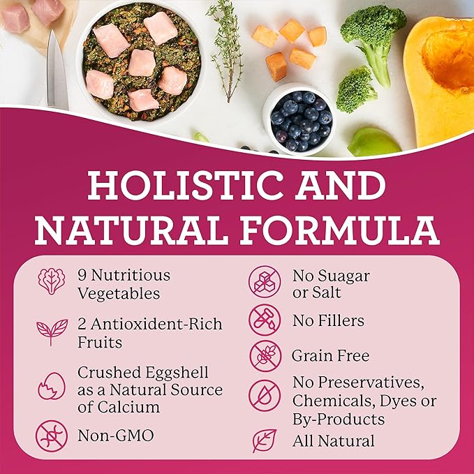 • Made with 9 dehydrated vegetables, 2 antioxidant rich fruits, 2 energy packed seeds, bone meal and crushed eggshells for calcium, and 9 other immune boosting superfoods