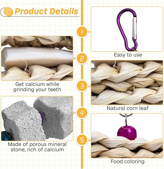 - Package includes 2 pieces of different bird chewing toys, natural cuttlebone grass loofah sponge dough twist, and lava block beak grinding stone, which provides natural calcium and minerals