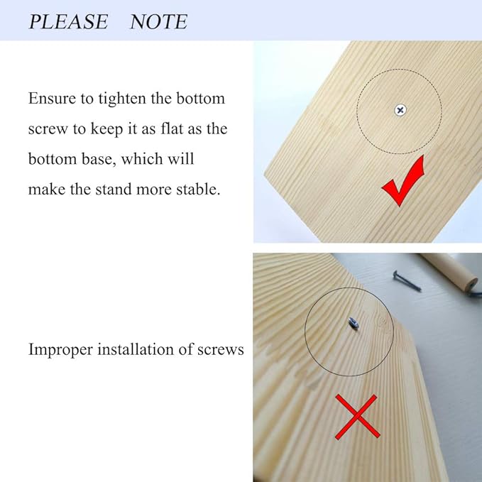 - KINDLY TIPS: 1.Wooden products in transit may lead to small amount of wood chips, it is recommended to wipe before installation. 2.Ensure to tighten the bottom screw to keep it as flat as the bottom base, which will make the stand more stable.