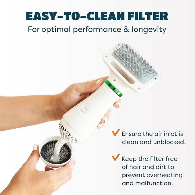 - 【Overheat Protection & Adjustable Temperature】 Select between low (104°F) and high (140°F) heat settings to suit your dog's needs. Always keep the brush moving to avoid skin burns. The dryer features an overheat protection system that automatically shuts off when it gets too hot. For optimal performance and to prevent quick overheating, regularly clean the filter of hair and dirt.