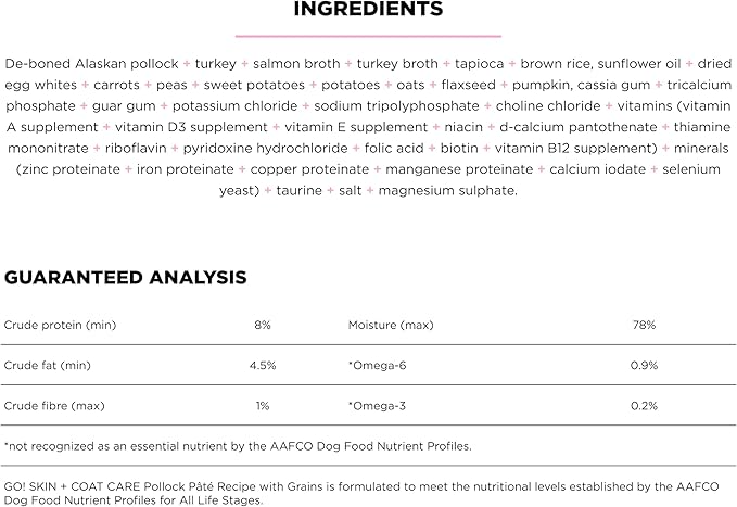 Go! Solutions Skin + Coat Care, Wet Dog Food, Pollock Pâté with Grains Sensitive Skin, 12.5 oz