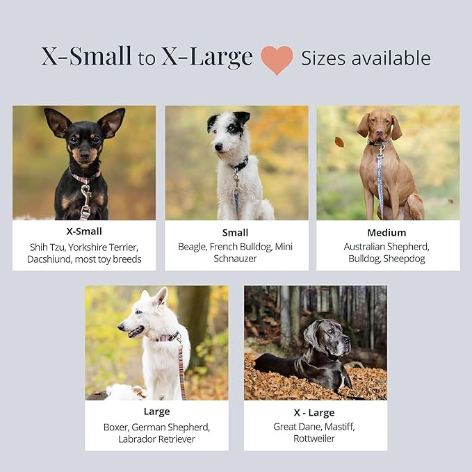 - 🤍CONVENIENT AND RELIABLE - EASY CLICK ON/OFF COLLAR BUCKLE GETS YOU AND YOUR DOG OUT THE DOOR QUICKLY! Our collars are durably constructed with an easy click, strong buckle, weatherproof D ring and HIGH DENSITY nylon. Our soft and flexible collars are dog approved – they are super comfortable, as well as long lasting. Washable by hand or on gentle cycle. Lucky Love Dog adjustable collars come in four or five sizes (depending on pattern). SEE SIZING BELOW