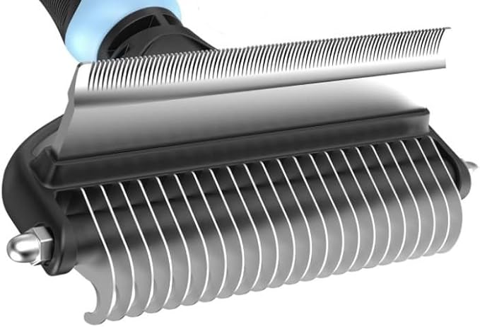 - GENTLE ON YOUR PET’S SKIN: Our deshedding tool features fine, rounded teeth that glide through your pet's fur without irritating their skin. This versatile double coat dog brush for dogs works effectively on all coat types and suitable for both cats and dogs.