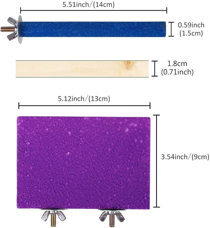 - ★ ☀❤SIZE AND PACKAGE - The parrot perch stand platform is 5.12 x 3.54 x 0.71 inch/2.36 x 0.7 inch and multiple types of boards allow your pet to choose freely. The length of the paw grinding stick is 5.51 inch/ 7.1 inch. Perfect bird cage accessories toys to decorate your birds cage. You can get 4 or 12 pcs parrot perch toys with one purchase.