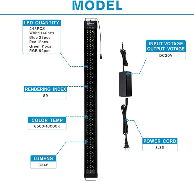 - New Upgrade: Lamp beads IP68 waterproof, and easy to clean and wipe. The separable adapter, even if it is damaged, no need to replace the light to avoid waste. Power off memory function, after the power is restored, the local time of the light will default to 12 noon, other settings remain unchanged, and then continue to run. The extendable bending bracket can be adjusted in length and easy to install, and can be applied to various freshwater tanks