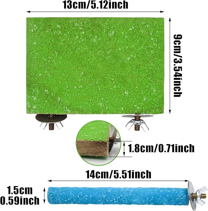 - Size: The parrot perch stand platform is 5.12*3.54*0.71inch/13*9*1.7 cm and two types of boards allow your pet to choose freely. The length of the paw grinding stick is 5.5inch/14cm and the diameter is 0.59inch/1.5cm.