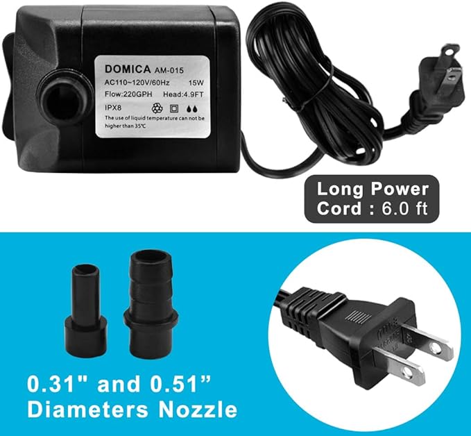 DOMICA 220GPH Ultra Quiet Fountain Pump (15W 800L/H), Small Submersible Pump for Pond, Water Feature, Aquariums, Hydroponics, Indoor or Outdoor Fountain