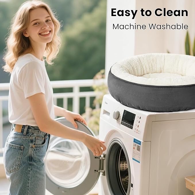 - DONUT CUDDLER SHAPE: The round dog bed allows pets to curl up while the raised rim creates a sense of security and provides head and neck support. Premium ultra-soft filling offers joint and muscle pain relief.The 20 inch round pet bed is perfect for cats, small dogs and other pets up to 15 lbs.