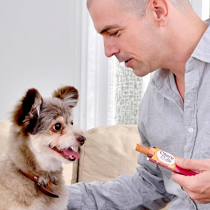 INABA Churu Rolls for Dogs, Grain-Free, Soft/Chewy Baked Chicken Wrapped Churu Filled Dog Treats, 0.42 Ounces Each Stick| 48 Stick Treats Total (8 Sticks per Pack), Chicken with Cheese Recipe
