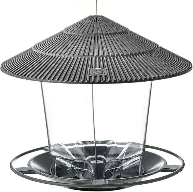 - Large Capacity: 8.5 x 7.9 x 7.3 inches. Made of durable, high quality plastic. The clear plastic make it easy to inspect bird seed levels. Hold up to 47 oz bird seeds. Large opening allows for easy refills and clean.