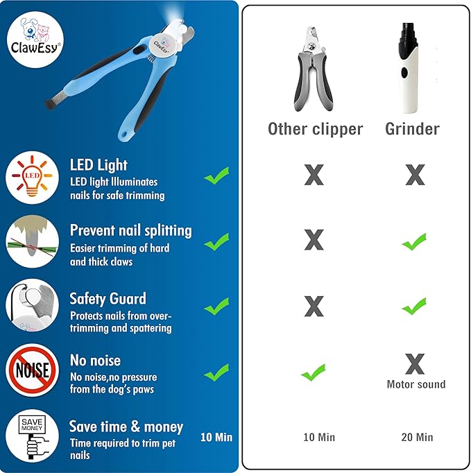 - PROFESSIONAL-GRADE NAIL CLIPPERS WITH LED LIGHT: Our high-quality stainless steel dog and cat nail clippers are designed for precision grooming. The built-in LED light illuminates your pet's nail quick, allowing you to trim with confidence while minimizing the risk of accidental cuts or bleeding. Enjoy a safe and stress-free grooming experience for your furry friends!