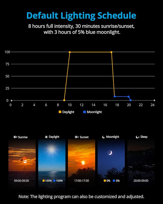 - Adjustable day and moonlight color spectrum and intensity with the wired switch on the power cord, day and night lighting channels can be operated together or independently