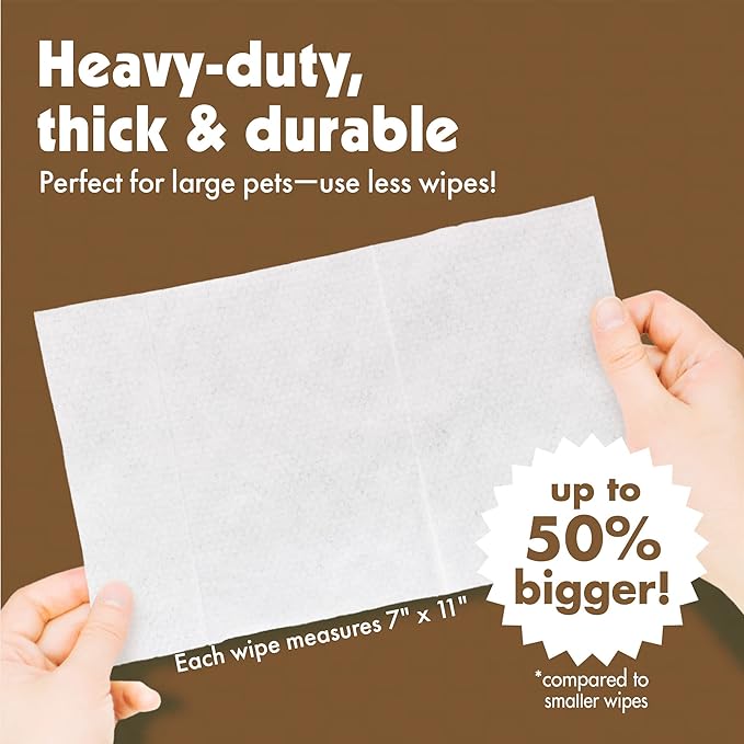- Use Less Wipes - The 7 x 11 inch Big 'n Thick wipes are larger than standard wipes, making them the smart choice for large pets and helps reduce how many wipes you need to use. Moistened with a gentle cleaning formula, and enriched with a soothing organic oat extract and skin-soothing aloe to keep your pet's fur soft, shiny and smelling great.