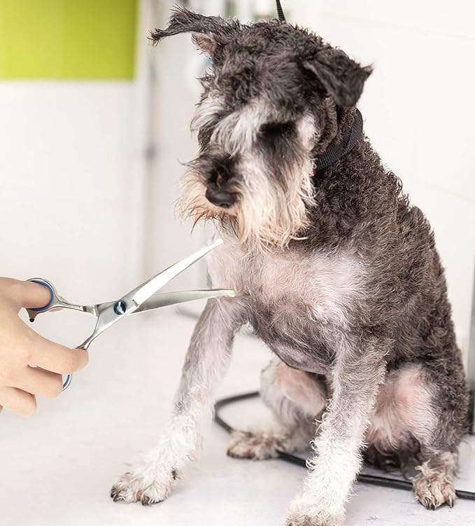 - Safety round head: Don't worry about accidentally poking them when trimming your pet's hair. This dog grooming scissor have a safety round head, even if you trim sensitive areas of your pet (face, ears, eyes, nose, paws) Provide security protection.