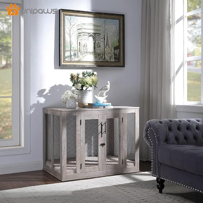 unipaws Large Dog Crate Furniture, Wooden Dog Kennel for Large Breed, Indoor Decorative Wood Dog Cage, Inside Side End Table Crate with Tray and Dog Bed, Dog Enclosure, for Dogs Up to 70 lbs