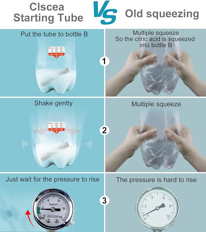 - * Tips: 1. The needle valve is only used to adjust the output volume, It only need to be adjusted once. Daily switching can be controlled by the white on/off valve. The reason for this is to ensures the gas output is stable. 2. DO NOT use bottles other than carbonated beverage bottles.