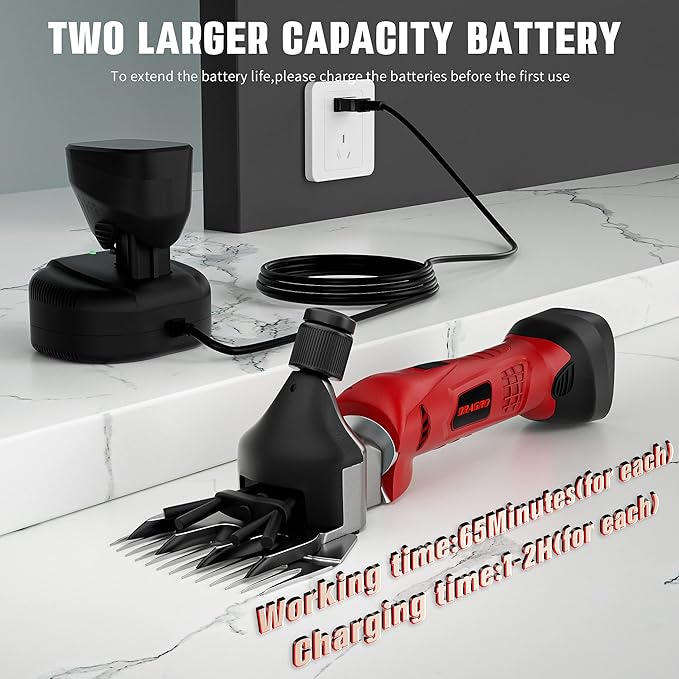 - 【Cordless Charge Shears】Comes with two 4000 mAh rechargeable batteries.Run time approximately 1 hours battery. No trailing cablesThis electric sheep shears allows you to efficiently cut your pet's hair, even if your pet is moving.An average of 8-10 sheep can be trimmed in an hour, suitable for families or pastures.