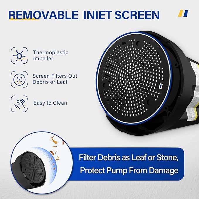 - 【DETACHABLE SCREEN & ADAPTER】: Submersible utility pump with detachable bottom screen design, filters debris, protect water pump from damage and remove water down to 1/4 in of surface. The drain pump comes with 3/4" garden hose adapter. 1-1/4" NPT discharge for higher flow. You could connect 5/8in diameter or larger garden hose depending on your need.