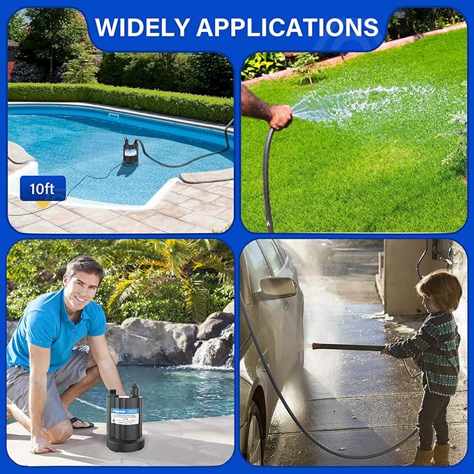 - 【WIDE APPLICABILITY】: Submersible pump can be operated easily by plugging into the power supply. Suitable for draining water from swimming pool covers, basements, pits, ponds, window wells, rain barrels or other flooded areas. Utility pump is also perfect for irragating, garden cleaning, car washing and other home requirement.