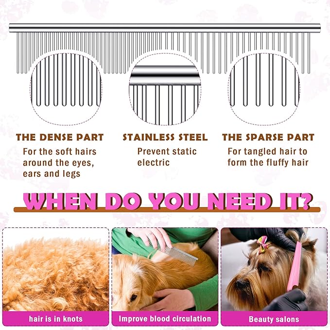- Sturdy material: the pets comb kit is made of stainless steel and plastic material, the stainless steel comb is rustproof because of wet after using, the comb needles are embedded in the plastic grip, which can fix on the grip tightly, the plastic material is also not easy to deform and fray, which can be kept for a long time