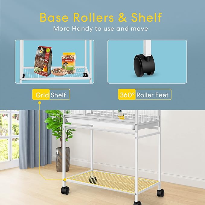 - MULTIPLE FUNCTIONS - The design with a flat top gives you more free space to hang bird toys or put some potted plants to decorate the appearance of your cage, increasing the enjoyment of the bird cage; Different decorations and useful equipment can be hung on either side of the cage or put on the mesh shelf