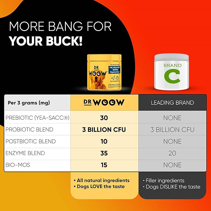 - PET PROBIOTICS FOR DOGS WITH BIO-MOS, YEA-SACC, 7 STRAIN PROBIOTIC BLEND: Help your dog's digestion with the combination of pre, pro and post biotics to strengthen your dog's gut, restore biome health, and maintain a healthy immune system