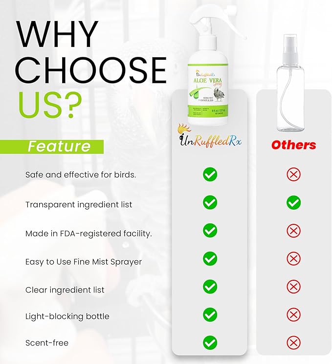 - MADE IN THE USA- QUALITY- TESTED FOR SAFETY, EVERY STEP OF THE WAY Proudly made in the USA, our aloe bird spray is blended in an FDA-registered facility where quality and safety come first. Every ingredient is tested before production, and the final formula is tested again for purity. Each bottle includes a lot number, expiration date, and full ingredient list—so you know exactly what’s in it. Real transparency for your bird’s safety and your peace of mind.
