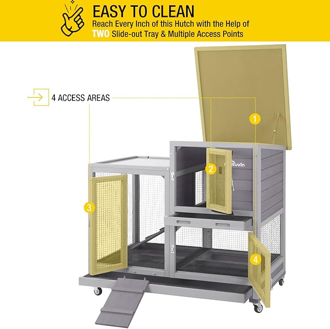 - Bunny hutch with TWO DEEPER pull out trays that won’t leak off and easy-to-clean.