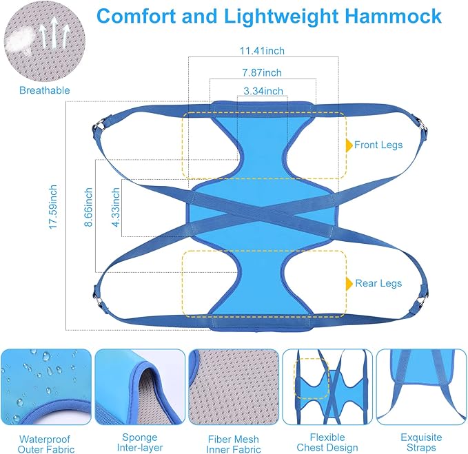 - 【Choose the Right Size - S】Please read the size chart and measure the distance between your pet's front and rear legs before purchasing. S size is for small and medium dogs(6 - 15 LBS). Stable hammock will protect your pet wouldn’t falling down.